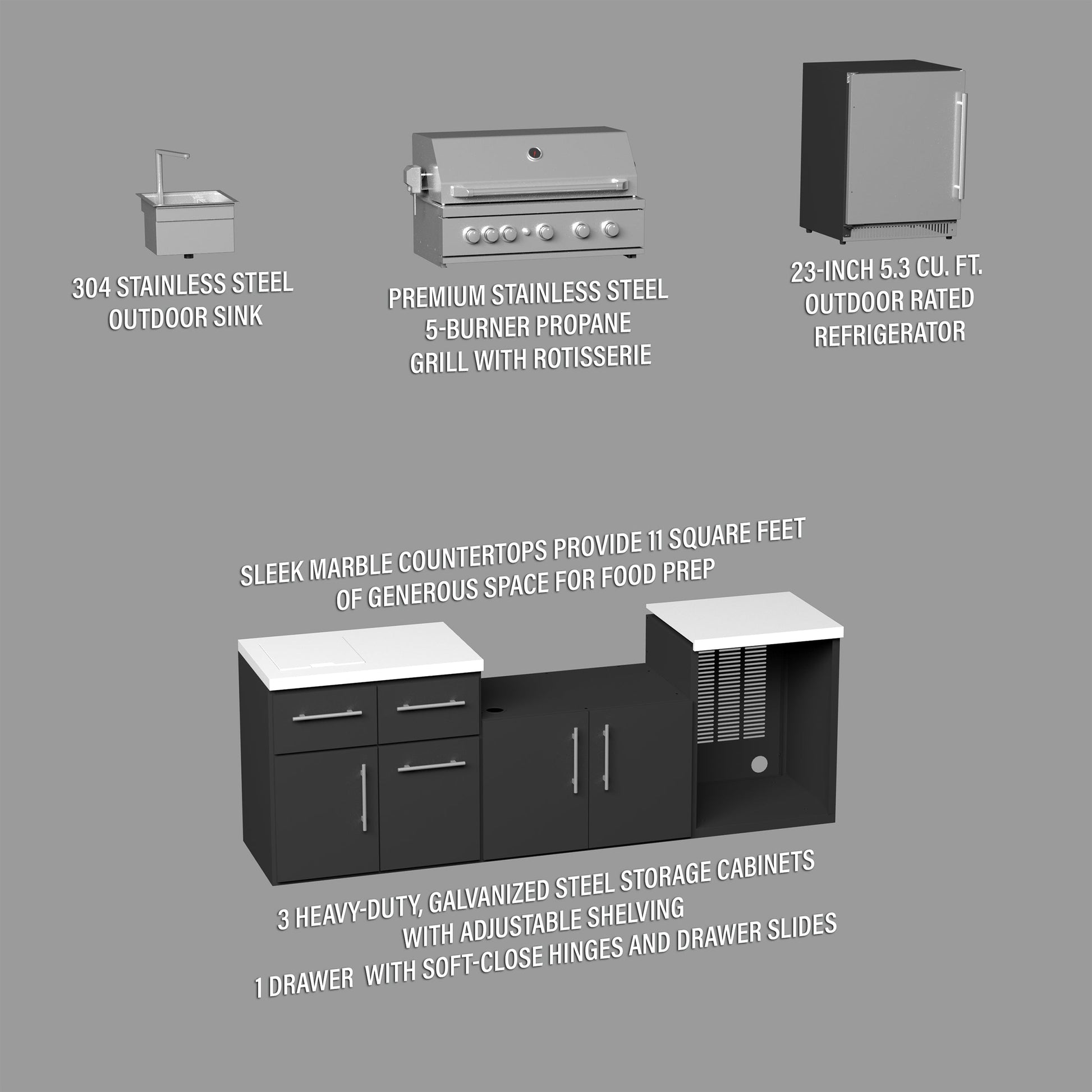The expansive marble countertop provides ample space for meal prep and drink mixing, while the integrated outdoor-rated refrigerator with LED lighting keeps ingredients and beverages chilled. Additional thoughtful features include a stowaway stainless steel sink with removable marble cover, soft-close drawers and cabinets for storage, and a discreet pull-out trash bin to keep your space organized. Designed for both covered and open-air patios, the Emory Outdoor Kitchen Island blends functionality and style to transform your backyard into a sophisticated culinary oasis.